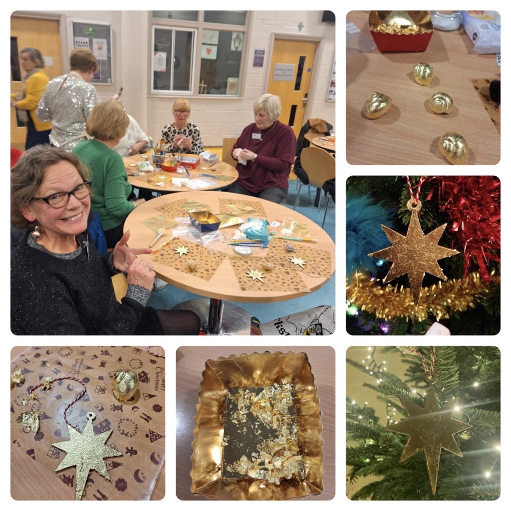 Thank you Lucy Anne for a gold themed evening of gilding! Our Christmas trees and decorations were even shinier this year with the addition of the gilded stars and snails we made at our December meeting. We glued and brushed our way to success learning new words (skewings*) and having a jolly good chat as we did so. Thank you to Lucy Anne and her elves (Angie and Mary) who helped to ensure that we didn’t get stuck by gluing our fingers to our decorations! Thank you also to our Refreshments Team and Carolyn for adding some extra sparkle to our festive fizz this year!