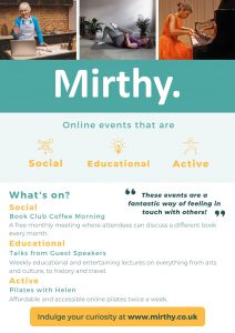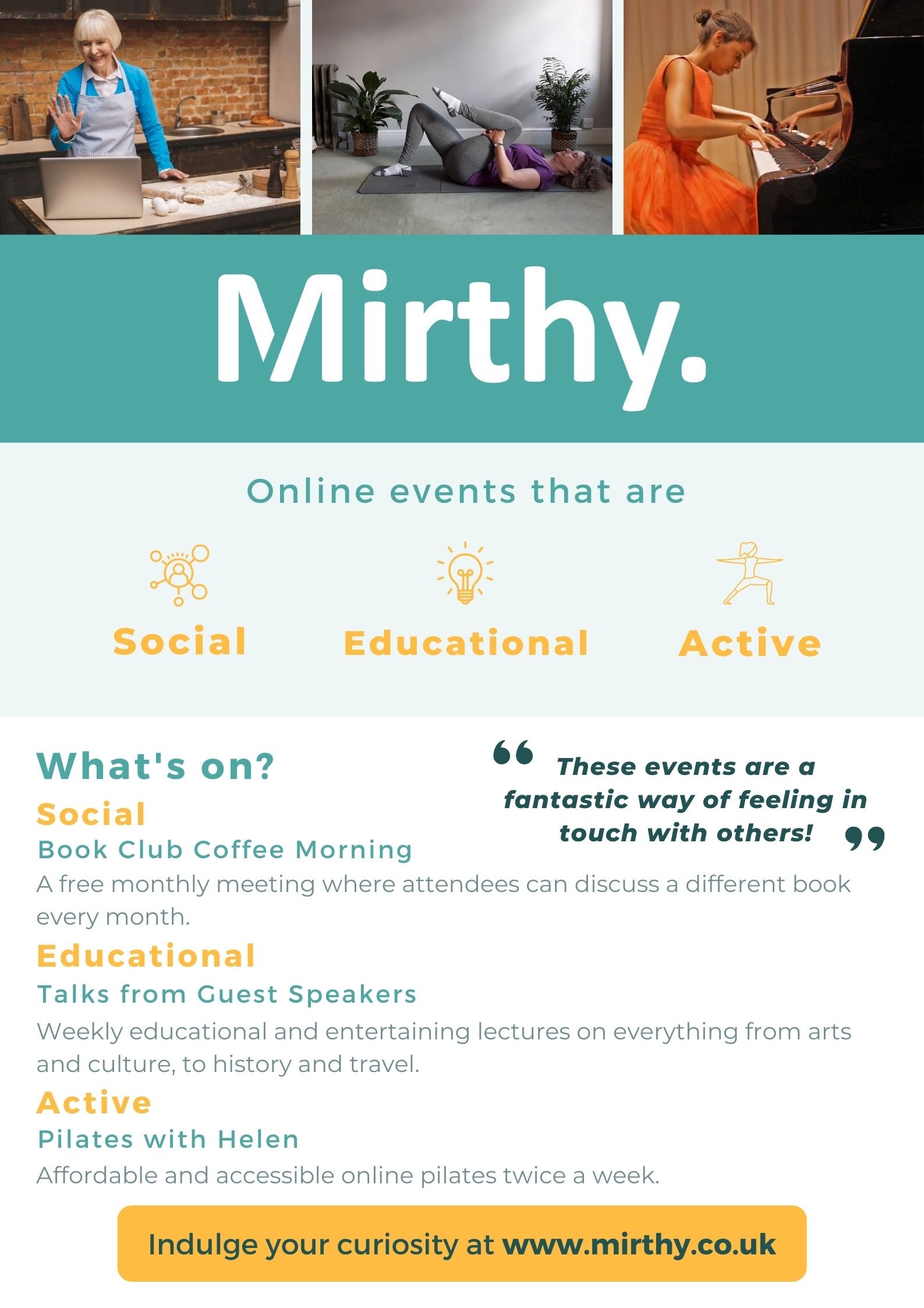 Mirthy are a community of over 30,000 in the UK putting on online events for lifelong learning and social connection. Online events cover a variety of activities and interests such as pilates, yoga, musical concerts, cooking demonstrations, dancing and craft workshops, educational lectures, with many more to come. There is a FREE event each week – see attached general information poster above and check out www.mirthy.co.uk for further details. If you have any questions feel free to contact