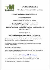 West Kent Federation would like to invite you to a Zoom talk “Weather forecasting – the history and what the science tells us about the future”. To register for the talk, please either email or write to Carol Gupwell – click on flyer link below for details