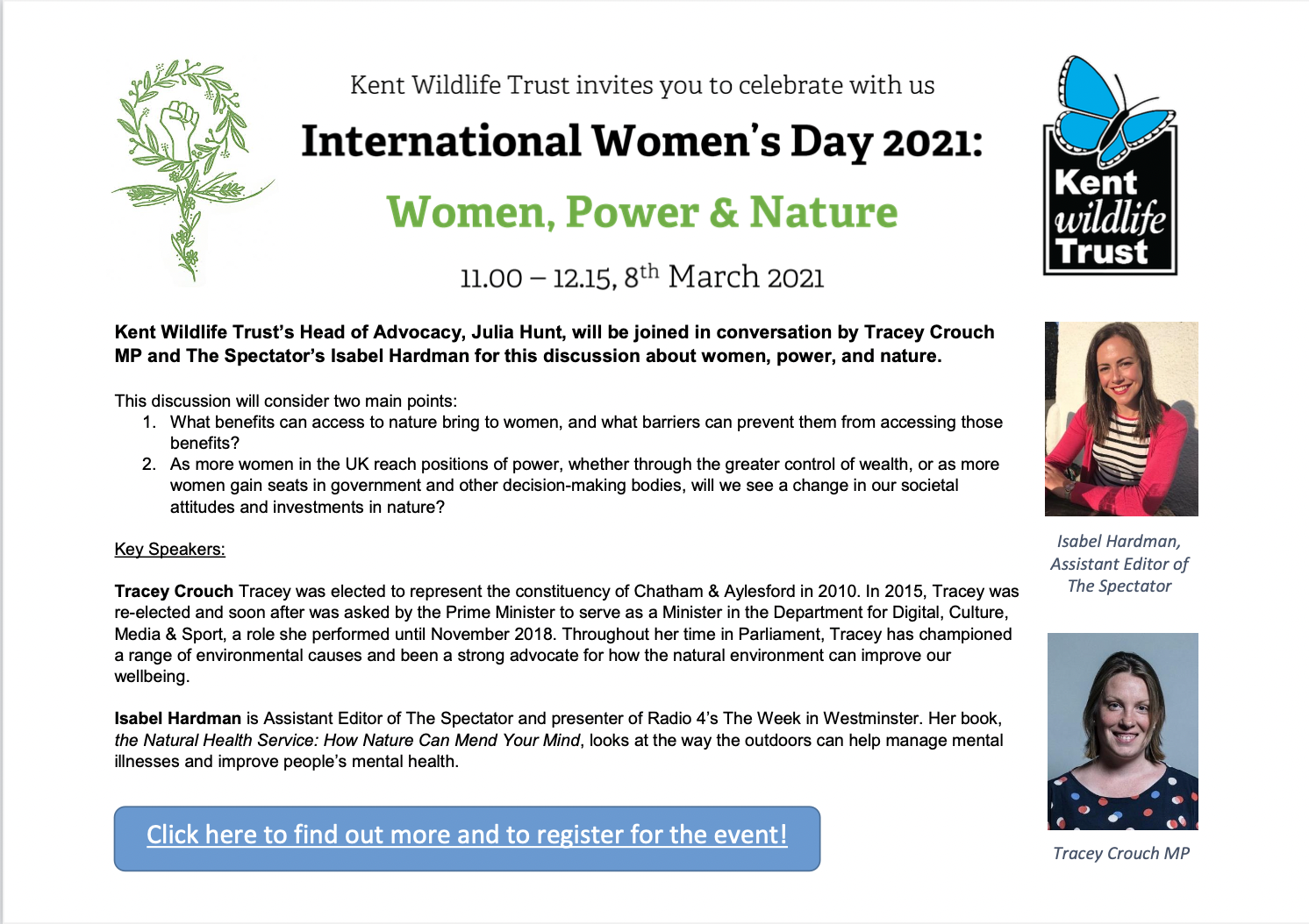‘Women, Power and Nature’ will be hosted by Head of Advocacy, Julia Hunt, and in discussion with Tracey Crouch MP and author of The Natural Health Service, Isabel Hardman, on 8th March 2021 at 11am.