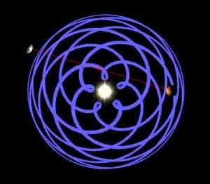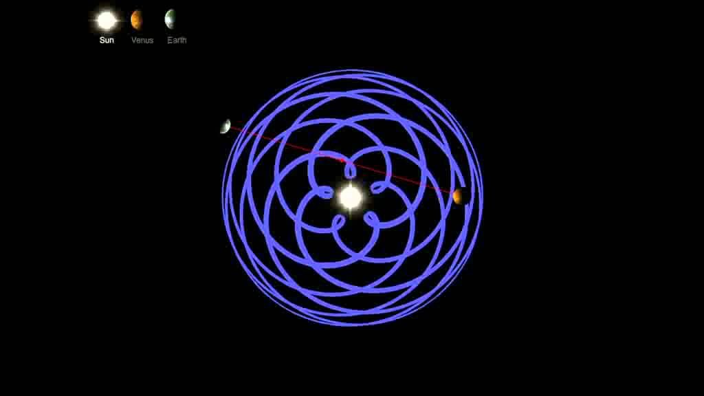 Last Thursday 37 of us joined in for our zoom meeting with artist Amber Khokhar. Amber is a return speaker for us and it was good to see her again albeit remotely from her studio in Deptford. Amber spoke of the way geometry was used by ancient thinkers as a way of describing and understanding the universe and the mysteries of life. The symbolism of the shapes created – the circle as the mother of all shapes, the vertical axis being between heaven and earth and the horizontal axis representing the horizon. It was also interesting to see the way women were very important in the symbolism (The circle being a representation of the sacred feminine, fertility and birth). All this information plus fascinating and beautiful visuals from art and nature (like this one showing the orbit of venus) to illustrate the talk.