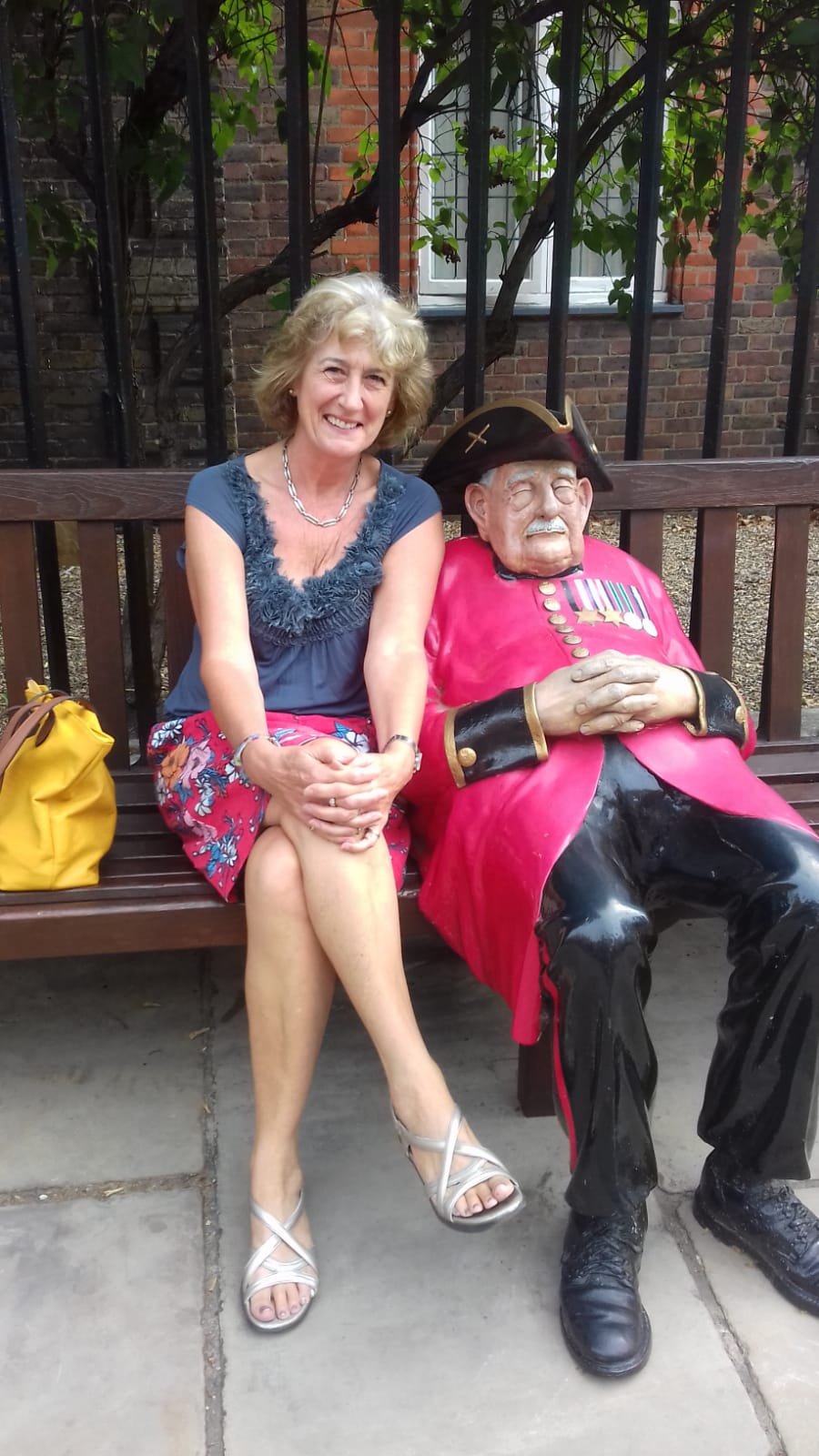 It looks like Caroline just made a new friend! Around thirty of us braved the heatwave to be shown around around the Royal Hospital Chelsea by a real Chelsea Pensioner called Brian. We learned about the history of the Wren designed hospital and who is eligible to retire there – aged over 65, unencumbered by spouse and having had 12 years service in the army. Only recently were women also allowed to become residents. We were shown the magnificent Great Hall and the stately Chapel, where we were invited to sing ‘Jerusalem’.