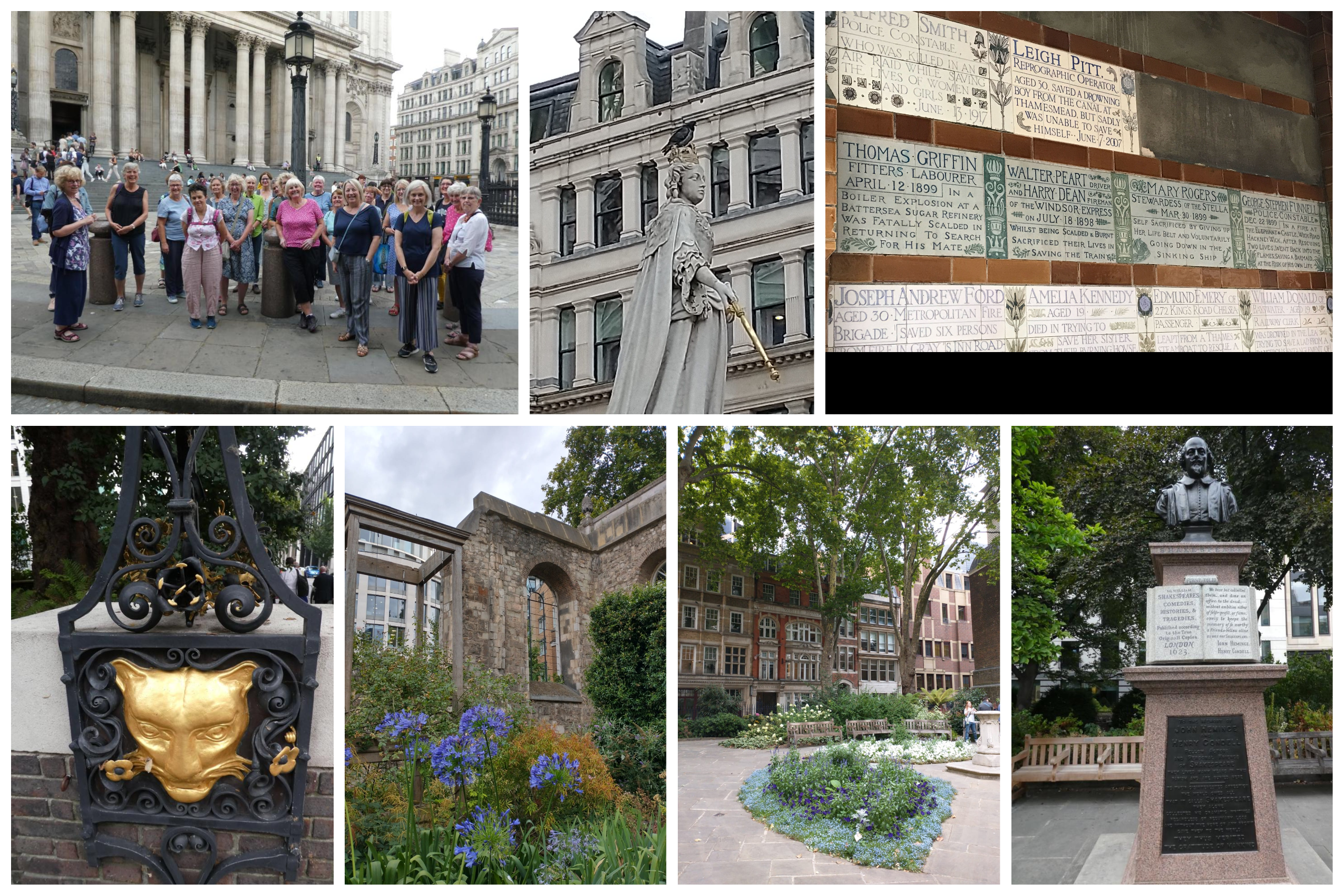 Jenny and Elaine took us on a thoroughly enjoyable walk through the City of London on a perfect summer’s evening for walking. Starting at St Paul’s Cathedral and the statue of Queen Anne, our stops included Paternoster Square and Temple Bar, Cutlers’ Hall, Old Bailey, St Sepulchre’s, the lovely gardens of Christchurch Greyfriars, Postman’s Park, the old Roman city walls and the Guildhall. We met new people such as John Heminge and Henry Condell in the former churchyard of St Mary of Aldermanbury, the heroes of Postman’s Park and a passing group of Wax Chandlers in their finery, as well as learning so much about the City on our doorstep.